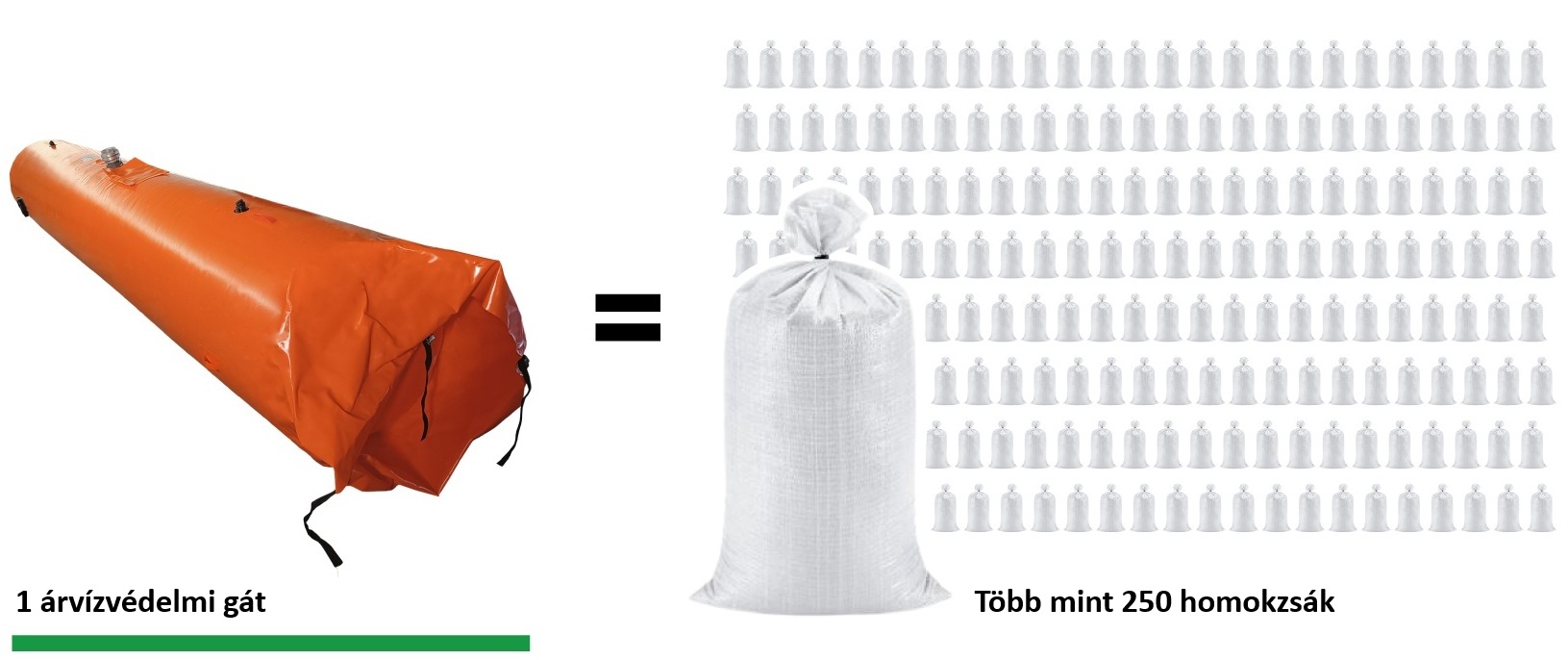 Egy telepített 1 m × 0,5 m × 0,4 m méretű Exflo gát helyettesíthet több mint 250 homokzsákot, hatékony árvízvédelmi falat létrehozva. Ez egy modern és gyors megoldás, amely időt, helyet és erőfeszítést takarít meg egy terület víz elleni biztosításakor.